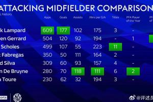 英超时代进攻中场球星的横向对比图。进球最多的是兰帕德;唯一没拿过英超冠军的杰拉德是入选职业球员工会赛季最佳阵容次数最多的;斯科尔斯收获的英超冠军最多;德布劳内则是助攻最多、直接参与进球效率最高而且两次拿到赛季最佳球员的奖项。如果这七大中场在451的阵型中挑选五位首发,你的选择会是.............? 太难了!个人选杰拉德单后腰,大卫-席尔瓦和德布劳内分居两侧,中间是斯科尔斯和兰帕德。