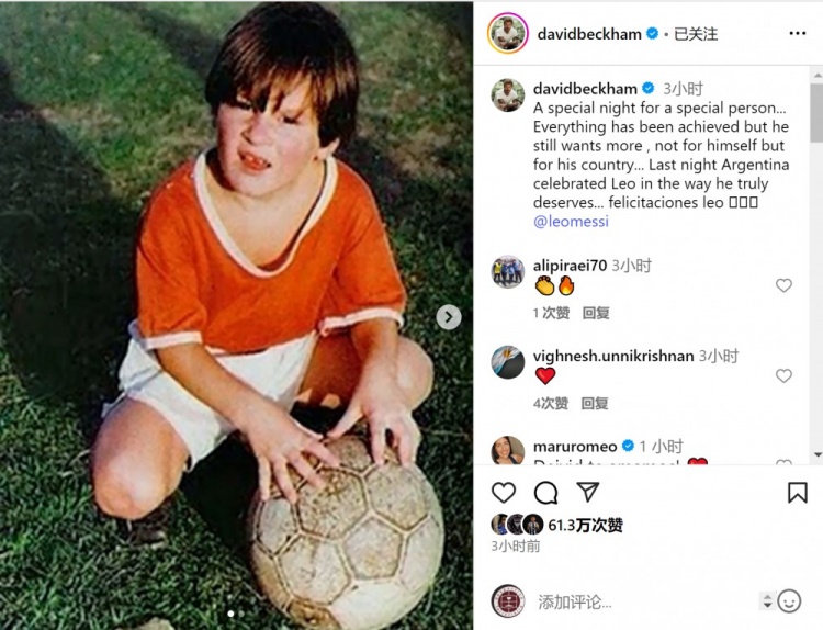 赛后,英格兰足坛传奇、迈阿密国际俱乐部老板贝克汉姆在社交媒体分享梅西童年照片,并配文:"这是一个特别的夜晚,属于一个特别的人……他已赢得所有荣誉,却依然心怀渴望——不为个人荣誉,而是为了国家而战……阿根廷用最恰当的方式向莱奥致敬……祝贺你,传奇。"