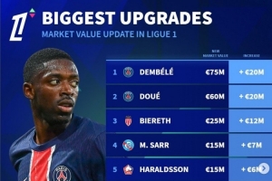体育资讯-法甲身价更新升值榜:登贝莱&杜埃均上涨2000万欧,比雷斯在列